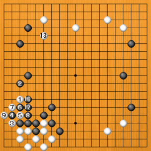 (正解) 白1(C)の打ち込みがいいところで100点満点です。黒2のコスミで白のサバキを防ぎたいのですが、ここで白3とハネる手を用意しています。黒4のオサエに白5と切るのが手筋です。黒6のカカエに白7と切って9とマクります。白11と抜いて、白は先手で荒らすことに成功しました。それから白13とトベば、理想的な進行です。 |