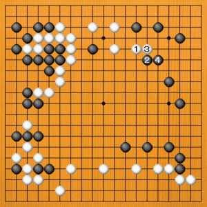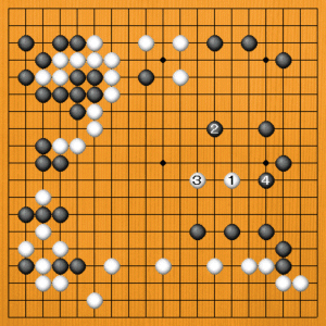 白1(C)は方向が違います。黒2と追われると、白3と逃げなければなりません。自然に右上の黒地が膨らみます。さらに、黒4と守って、黒地がしっかりまとまります。 |