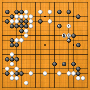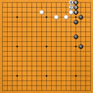 黒1にコスミツケれば、白2のサガリから黒5とオサえるまでを境界線として考えます。 |