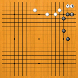 白1に黒2と受けてくれれば立派な利かしです。白3とボウシして、黒模様を減らしながら中央の白を広げます。 |