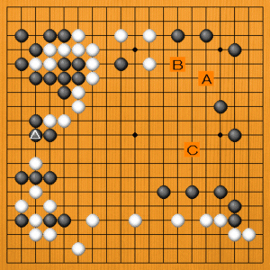 黒△とツイだところです。次の一手を、A~Cの選択肢の中から示してください。 |