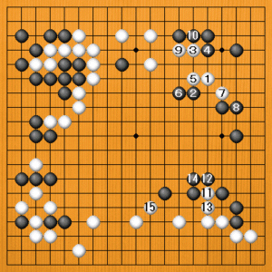 (実戦) 白1に黒2とカケたのが実戦です。白3のノゾキから9のオサエまで決めて、先手で連絡形にしました。さらに白11の割り込みから16まで、下辺の地を固めました。白が手順よくヨセています。 |
