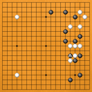 黒△とアテたところです。白はどう打つのがいいでしょうか。筋場に石が行かないように考えてください。 |