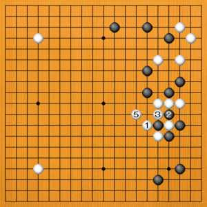 白1と外からアテて、黒2と抜かせるのが手筋です。白3とアテて5とカケツげば中央に向かってしっかりした形が作れます。 |