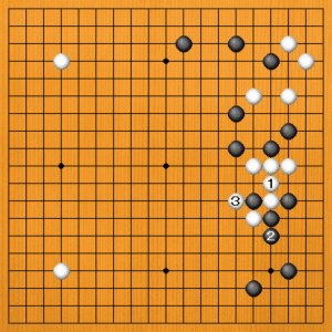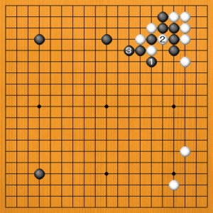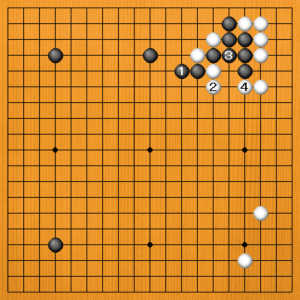 白1にツグのはアキ三角が二つ出来る愚形です。黒2の引きに白3とカカえますが、白1の石がつら過ぎます。 |