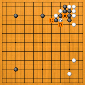白△とアテたところです。次の一手を、A~Cの選択肢の中から示してください。 |