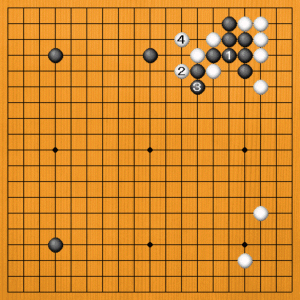 黒1のノビには、白2とノビて来ます。黒3のツギは仕方ありませんから、白4とオサえて、白がうまく整形しています。 |