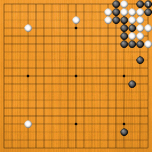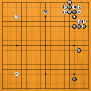 (手順) 右上で定石が出来ました。 黒19のサガリに白20とヒラいたところです。 |