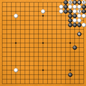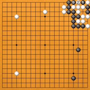 黒1から3とツイで四子にして捨てます。この後はどうなるでしょうか。 |