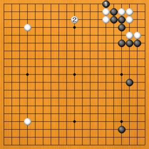 (参考図) 黒1のハネの場合は、白2とヒラけます。隅はこのままで生きているのです。 |
