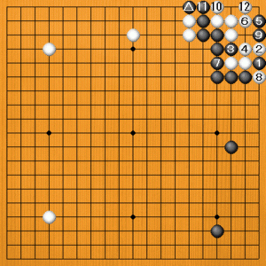 黒1のハネから3と出る手順を確かめてみましょう。黒9までは前述の手順と同じです。黒△の場合は、ここで白10のサガリが利きますから、白12と眼を作って生きるのです。この違いを覚えておきましょう。 |