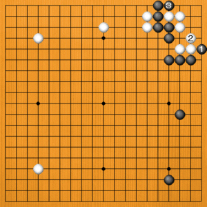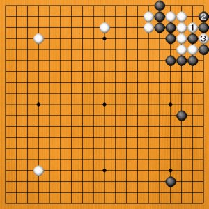 白1のアテには黒2と出る手がありますが、白3でコウになります。コウでは黒がつらいのです。 |