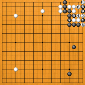 黒1に白2とオサえてみましょう。黒3の切りは失敗で、白4のツギに黒5と抜いても、白6とアテて手になります。黒7のツギは白8から10で無条件で生きてしまいます。 |