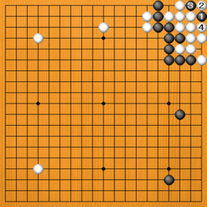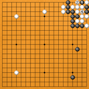 黒1の抜きは、白2とアテられてただでは取れません。黒3のアテは、白4でコウになります。 |