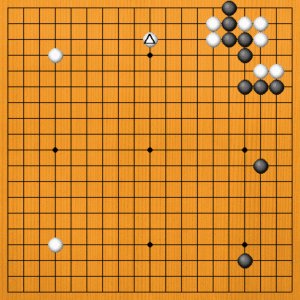白△とヒラいたところです。右上の白はどうなっているのでしょうか。A~Cの選択肢の中から示してください。 A=すでに生きている B=黒番で死んでいる C=コウになる |
