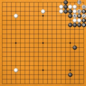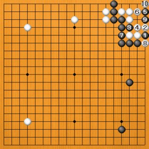 白1に対して、黒2とツケるのが妙手です。白3とさえぎるしかありませんが、黒4と抜いて、白5の抜きに黒6と抜き返します。白7のアテには、隅は手を抜いて黒8と外側を固めるだけで十分です。白9の二子取りに黒10と抜き返して、隅は“マガリ四目”で白が死んでいるのです。 |