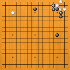 (手順) 黒が小目からシマっている形には、白1のツケから7のカケツギまで、隅で生きようとする手順があります。この白がどうなるか、考えてみましょう。 |