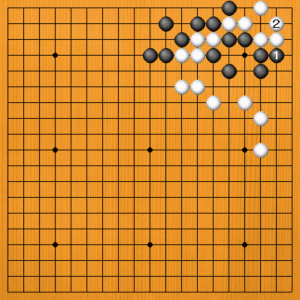 この場合は、黒1のサガリから決めて、白地を2目にするのが最善です。 |