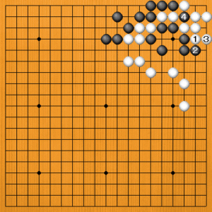 白1とホウリコめば黒2とアテます。白3の抜きは、黒4でコウになります。 黒3で、(次の図へ) |