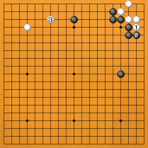 白1のハイを決めてから3とシマったところです。右上の白はどうなっているのでしょうか。A~Cの選択肢の中から示してください。 A=生き B=死に C=コウ |