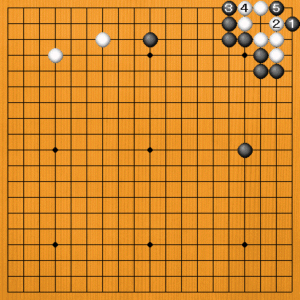 黒1のサガリも手筋なのですが、この場合は白2とヘコまれて生きてしまいます。黒3のハネに白4とヘコんで二眼作ります。黒5のアテが利いて白地は2目ですが、ともかく生きては黒の失敗です。 |