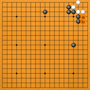 この形ではどうなるでしょうか。じつは、白aと黒bの交換は白の悪手だったのです。 |