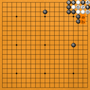 黒1と急所に置きますが、白2とオサえられます。黒3のサガリに白4とホウリコんで、先に見たような手順ですが、状況が違っているのです。今度は黒5のアテに白6とツイでいいのです。黒7と抜いたときに、白8とオサえてオシツブシになるのです。白aと黒bの交換がありませんから、白のダメが空いているのです。 |