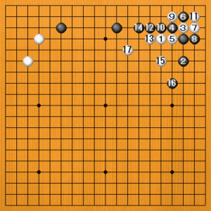 (手順) 黒の中国流に白1とカカった後の変化です。黒2と一間に受けるのは、狙いのある構えです。白3のツケに、黒4とハネ出すのが厳しい手です。白5の切りに、黒6のアテから8とオサえます。白9の切りから11とカカえて生きたつもりです。白17まで中央をくつろげたところで考えてみましょう。 |