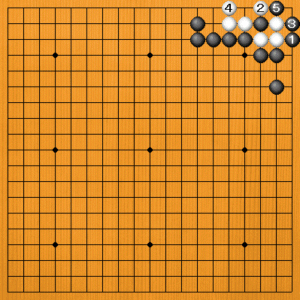 黒1に白2からオサえるのも、黒3とハネれば死んでいます。白4とオサえることはできますが、黒5と三子にして捨てればナカ手になります。 |