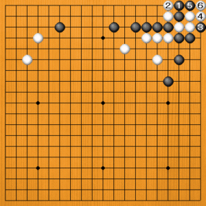 黒1には白2と抜きます。黒3とハッても、白4から6と眼を作ってきます。黒7とホウリコんでコウになりますが、無条件で取れるところですからコウでは失敗です。 |