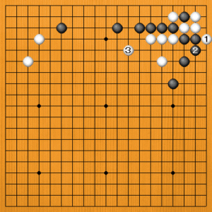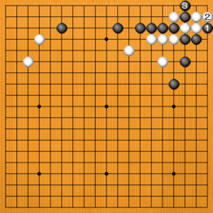 黒1のサガリに白2とオサえてくれれば、黒3とハネて死んでいます。しかし、白2では抵抗手段があるのです。 |