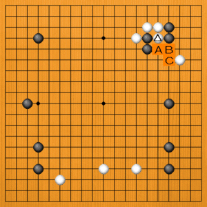 白△と出てきたところです。このハメ手をどうやって撃退したらいいでしょうか。次の一手をA~Cの選択肢の中から示してください。 |