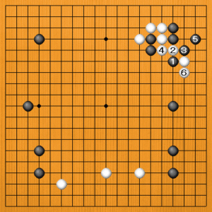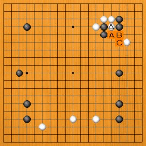 黒1(C)のツケも失敗です。白2のハネコミが厳しいのです。黒3のアテから5とカケツいで隅を守れば、白6とノビられます。中央に切り離された黒が苦しい形になりました。 |