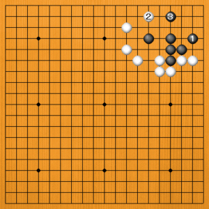 (正解) 黒1のオサエが正解です。白2と深く入って来るのは無理で、黒3とさえぎって取れています。 |