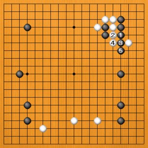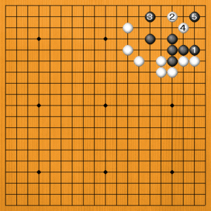 黒1に白2と置いてくれば、黒3と隅からオサえて守ります。白4とワタらせても、黒5の切りがあって、隅は大きく確保できています。 |