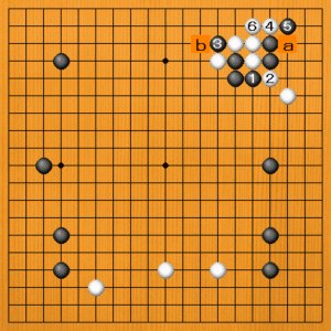 黒1(A)のオサエは失敗です。白2と切られると、黒が大ピンチです。黒3と切っても、白4、6のハネツギが好手で、白aの切りと白bのカカエが見合いです。 |