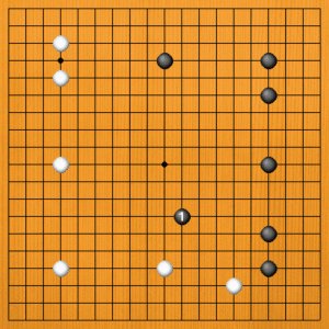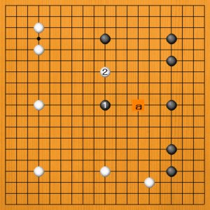 黒1は模様の中心点で、ここに打っておけば間違いないというようなところですが、白に響かないのがやや物足りないかもしれません。白2やaなど、白からの進入も容易です。
