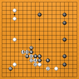 白も14とノビて左下方面が模様化されますが、黒15の三々入りがピッタリで、この流れは黒が気持ちのいいところでしょう。