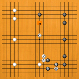白が受けないのですから、黒3のトビコミは当然です。白4と断点を補うのが厚い手ですが、黒5で右下方面を制して、黒に不満はありません。このあと白6に囲うか、aのボウシくらいになりそうです。