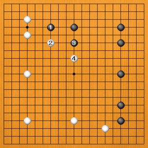 黒1と二間にツメるのは、ふつうの手ではありますが、白2のボウシがピッタリになります。黒3のトビに、さらに白4とボウシして、左辺から下辺にかけた白の幅がよく見えます。