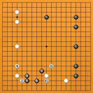 この展開を想定すると、黒1は打ちづらいかもしれません。黒はもっと高く、5線以上の位置に打ちたいとろこでした。