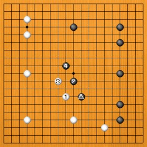 白も1と上辺に臨む感じかもしれません。これには黒2の一間から4とボウシするくらいでしょうか。△は、模様を大切にする打ち方でした。