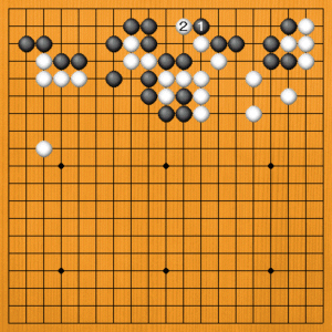 (正しい打ち方) 初めの手で、黒1とトブのが正しい受け方でした。白2と遮ってきても、黒3と切って取れています。 |