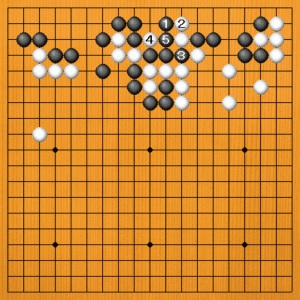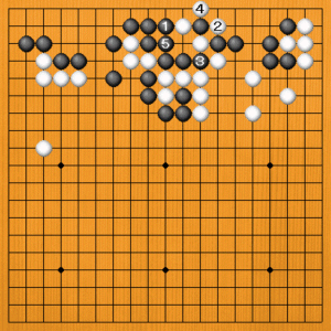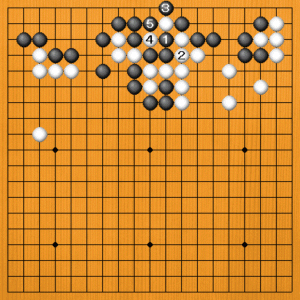 黒1とブツカるのはどうでしょう。白2とカカえてくれば、黒3の切りがアタリになりますから、白4の抜きに黒5とツイで、黒がうまくいきました。しかし、これは白2がまずかったのです。 |