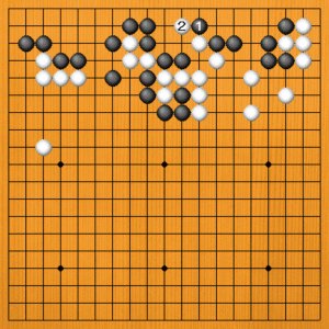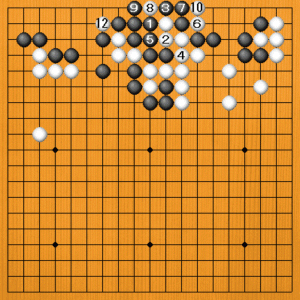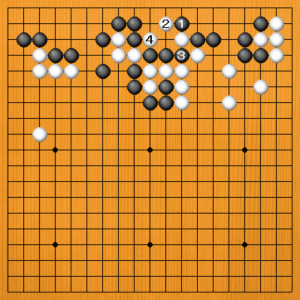 黒1に白2とハネたときに、黒3と切るのは、白4と切られて黒三子が取られてしまいます。 黒3で、(次の図へ) |
