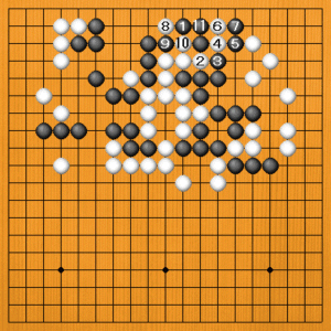黒1のオサエでは、白2、4の出切りを防げません。黒5から7とオサえても、白8と出られて困っています。黒9とオサえても、白10で取られてしまいます。黒1は10のところに、一つ緩むのが形でした。 |