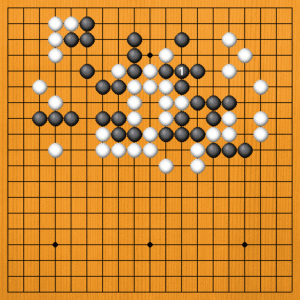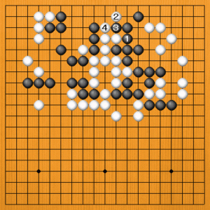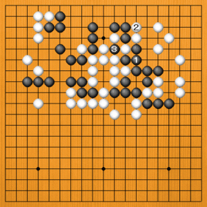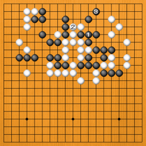 (正しい手) A=黒1のツギは正しい手です。失敗の原因はこの後の打ち方にありました。 黒1で、(次の図へ) |