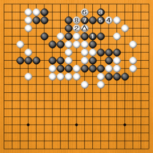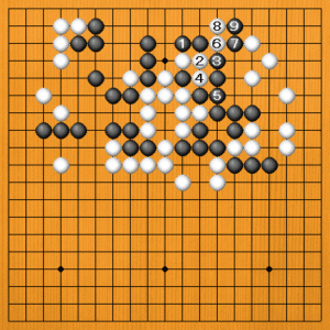 黒1とワタってもうまくいきません。もし、白2の出から4と抜いてくれれば、黒3から5とツイで黒がうまくいきます。白6と切っても黒7から取れています。 しかし、白2を期待すること出来ません。 |