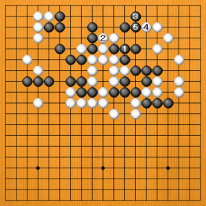 C=黒5とツイでもワタれませんが、すでに黒3と打った時点でワタれていませんから仕方ないのです。 黒5で、(次の図へ) |