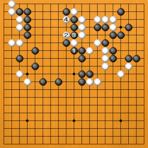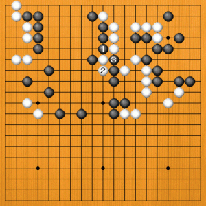 (正しい打ち方) 初めに、黒1とオサえるのが大事な手でした。白2と出ても、黒3と切ることが出来るのです。 |